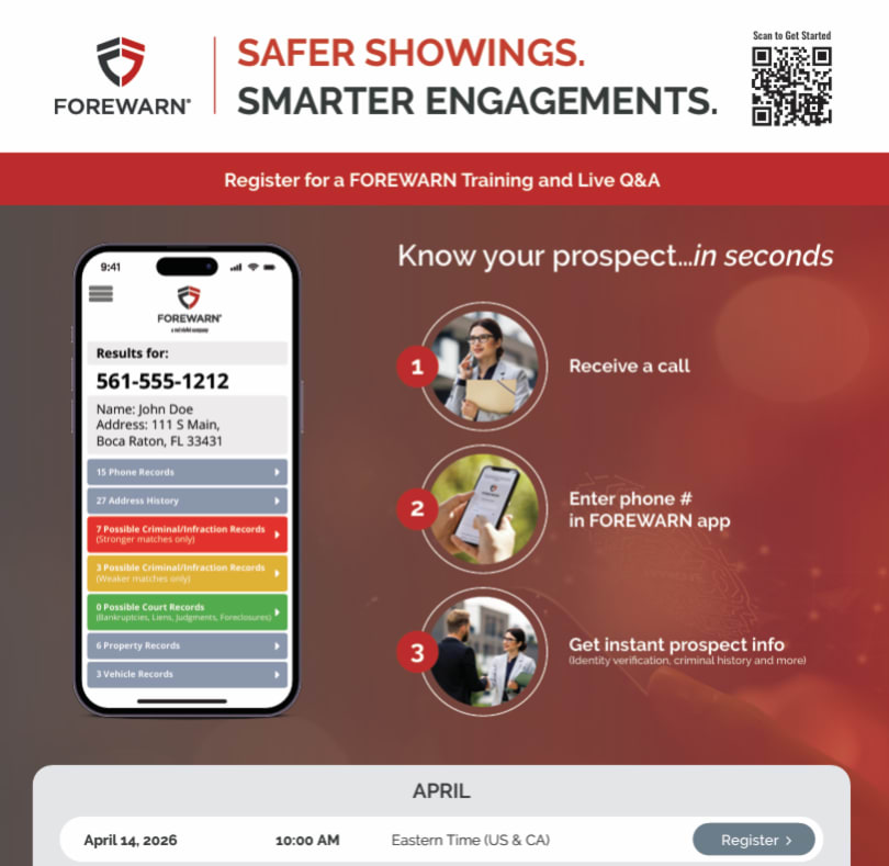 X-ALT-DESC;FMTTYPE=text/html:<!DOCTYPE html><html><head><title></title></head><body aria-disabled="false"><p><a fr-original-style="" href="https://us06web.zoom.us/meeting/register/nUH3h8_tSsOAZ7kVRnhlnQ#/registration" style="user-select: auto\;"><strong fr-original-style="" style="font-weight: 700\;"><span style="color: rgb(184\, 49\, 47)\;">CLICK HERE TO REGISTER</span></strong></a></p><p>With agent safety always a priority\, the next FOREWARN training to help you get the most out of the app. The next FOREWARN training is April 14 at 10:00am. Join us as we demonstrate how to best utilize FOREWARN\, share insider tips and tricks\, and host a live Q&amp\;A session.</p><p><img src="https://res.cloudinary.com/micronetonline/image/upload/q_auto\,f_auto\,c_crop\,w_811\,h_789\,x_-1/v1774967473/tenants/3371c927-a779-44ef-b1f0-2b42f1ebdc81/83a163b18e2243289d97074df3ab4402/Screenshot-2026-03-31-102611.png" width="806" height="785" fr-original-style="" style="position: relative\; max-width: 100%\; cursor: pointer\; padding: 0px 1px\;" fr-original-class="fr-draggable"><br></p></body></html>
